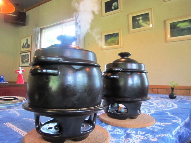 | 9 ご飯 木島平米に古代のお米紫米ブレンドかまどで お客様の前で炊き上げますあっあっ食べていただきます |