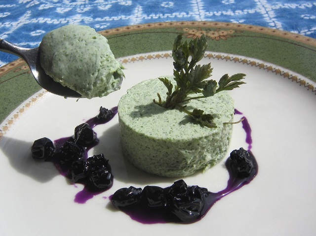 よもぎのムースハックルベリーソースで 前の山からヨモギ収穫ムースにしました |