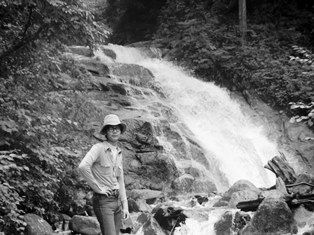 写真は「垂水の滝」。右の写真は平成30年当時の「垂水の滝」