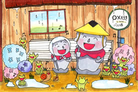 | 雪の山をスキーとスノーボードでス〜イスイ。人気のない月明かりの雪山で、華麗な滑りを楽しむお地蔵さんたちの楽しさが伝わってくるようです。敏捷そうなふたりの姿がナイス。影を生かし、立体感や遠近感をみごとに表現しています。 |