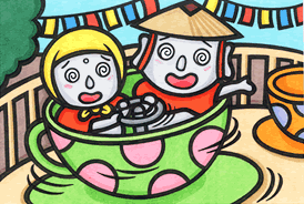 | お地蔵さんたちはハワイでどんなバケーションを楽しむのでしょう?意表をつく組み合わせが楽しいですね。観光ポスターさながらに、よく計算された緻密な構図と、ていねいな描きこみにより、完成度の高い作品に仕上がっています。 |