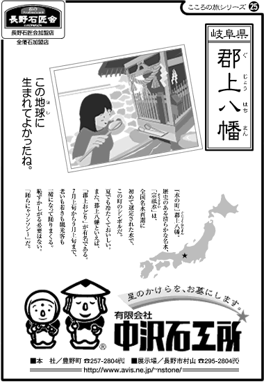 「水の町」郡上八幡(ぐじょうはちまん)。 歴史のある清らかな名水、 「宗祗水(そうぎすい)」は、 全国名水百選に 初めて選定された水で、 この町のシンボルだ。 夏でも冷たくておいしい。 また、郡上八幡といえば、 「郡上おどり」が有名である。 7月上旬から9月上旬まで、 老いも若きも観光客も 一緒になって踊りまくる。 恥ずかしがる必要はない。 「踊らにゅソンソン!」だ。