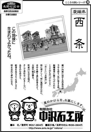 瀬戸内海に面する西条市が 今年も祭り一色に染まる秋。 絢爛豪華に飾りつけられた 130台もの「だんじり」 「みこし」「太鼓台」が 時に凛々しく、時に風情ゆたかに、 市中を練り進む西条まつり。 太鼓や鉦(かね)の響き、 町衆のいなせな唄声、 そして勇壮な「かきくらべ」。 息をのむ迫力と、 絵巻を見るような美しさに 時を忘れて夢中になる。