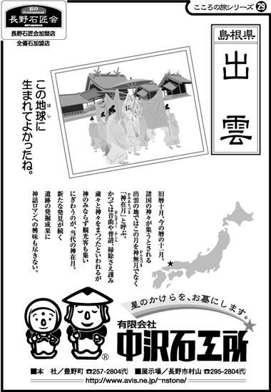 旧暦十月、今の暦の十一月。 諸国の神々が集うとされる 出雲の地ではこの月を神無月(かんなづき)ではなく 「神在月(かみありづき)」と呼ぶ。 かつては音曲(おんぎょく)や普請(ふしん)、掃除さえ謹み 粛々と神々をまつったといわれるが 神のみならず観光客も集い にぎわうのが、当代の神在月。 新たな発見が続く 遺跡の発掘成果に 神話ロマンへの興味も尽きない。