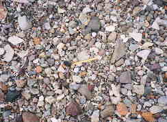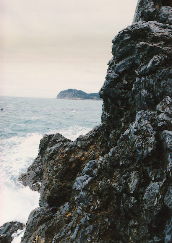 | 秋田男鹿半島の 黒曜石原産地 ● 写真下 男鹿半島金ケ崎海岸。ここで最大で拳大程度の黒曜石原石(円礫)が分布。 1997年10月 堤撮影 ● 写真右上 男鹿半島脇本の露頭。拳大の円礫が混じる。 ● 写真右下 男鹿半島金ケ崎の海岸の黒曜石。黄色いペンの先にみえるピンポン玉大の黒曜石の原石がおわかりになるのだろうか? |