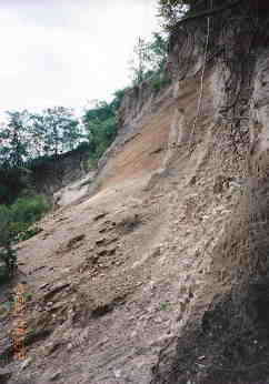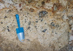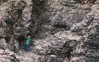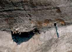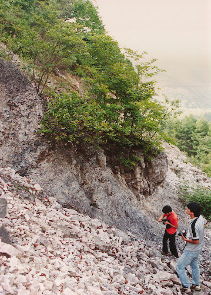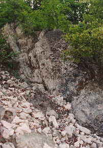 和田峠黒曜石原産地 (長野県) 写真は数少ない和田峠の黒曜石露頭 流紋岩中に黒曜石が脈状に貫入する。こうした露頭の石よりは、 旧石器人はむしろ、沢などで採取できる転石を利用したものと考えられる。 |