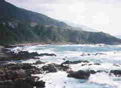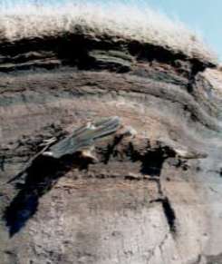 | 青森 出来島の黒曜石原産地 ● 写真下 出来島海岸。ここで最大で拳大程度の黒曜石原石が見つかっている。 1999年5月 堤撮影 ● 写真右上 出来島海岸の埋没林。最終氷期最寒冷期(2万5千年以上前)の埋没林とは思えないほど生々しい。 樹種は、トウヒなどの針葉樹である。 ● 写真右下 埋没林の直上からは、ATの純層が検出されている。断面に刺さった鎌の部分の白っぽい層がAT。 日本最北端で確認されるATである。 |