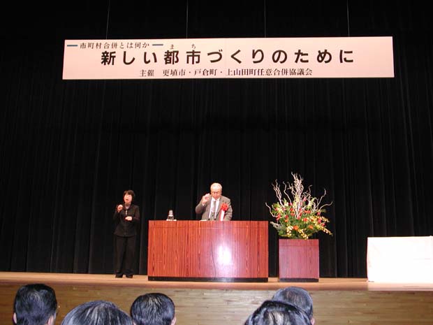 | 12月16日(土)に、更埴市・戸倉町・上山田町任意合併協議会主催の講演会「新しい都市づくりのために」が開催されました。講師は、東京都あきる野市長田中雅夫氏、関西学院大学教授小西砂千夫氏。両氏ともに熱の入った講演で会場は熱気に包まれました。 | ![]() |