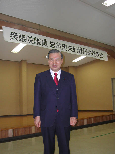 | 1月20日(土)午後7時から岩崎忠夫衆議院議員の新春国会報告会が屋代公民館で開催。当選後の議員活動の報告、あっせん利得処罰法案、税制改正等の最新情報等について、1時間ほど熱弁を振るった。来賓の宮坂更埴市長が国政への要望を交えながら祝辞を延べた。 | ![]() |