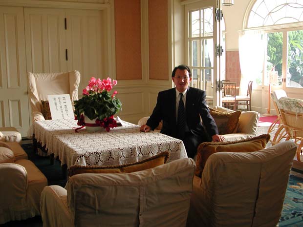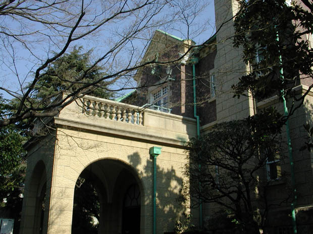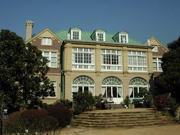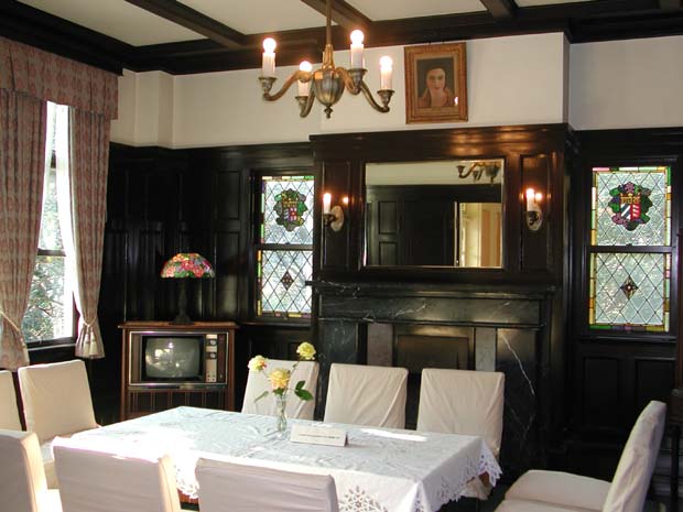 | 鳩山会館(音羽会館)正門-故鳩山一郎元総理の邸宅 | 芝生敷きの中庭から会館を望む | 応接室-白壁に黒い色の家具が調和し、窓のステンドガラスが落ち着きを演出する |